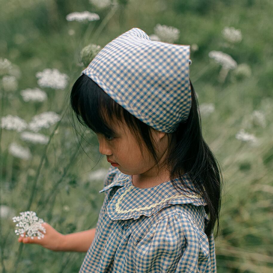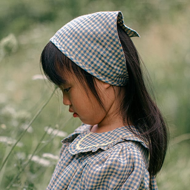 鮮やかなブルーと暖かみのあるイエローの小さなチェック柄が可愛らしいヘッドスカーフ。お揃いのリネン生地で仕立てられたワンピースと、ぜひ合わせてご着用いただきたいアイテムです。