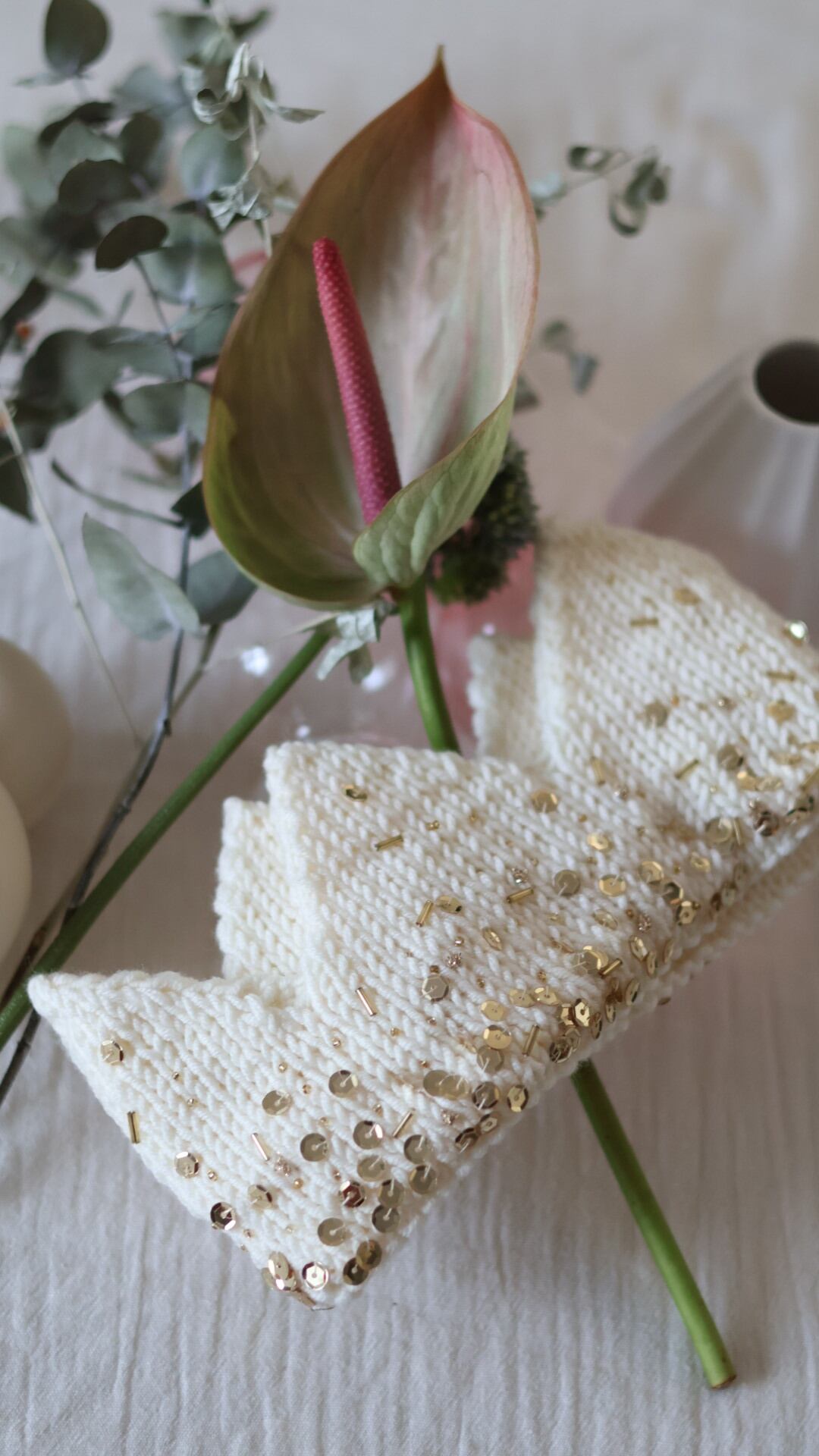 オフホワイト地にきらきらとしたゴールドのスパンコールと小さなビーズが手縫いで繊細まで美しく施されています。