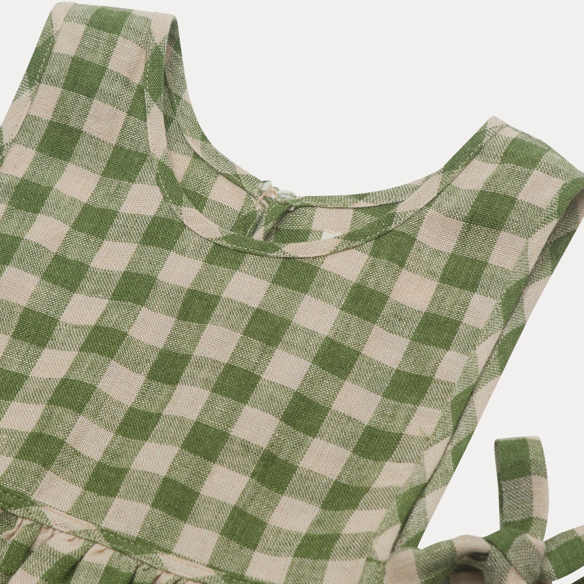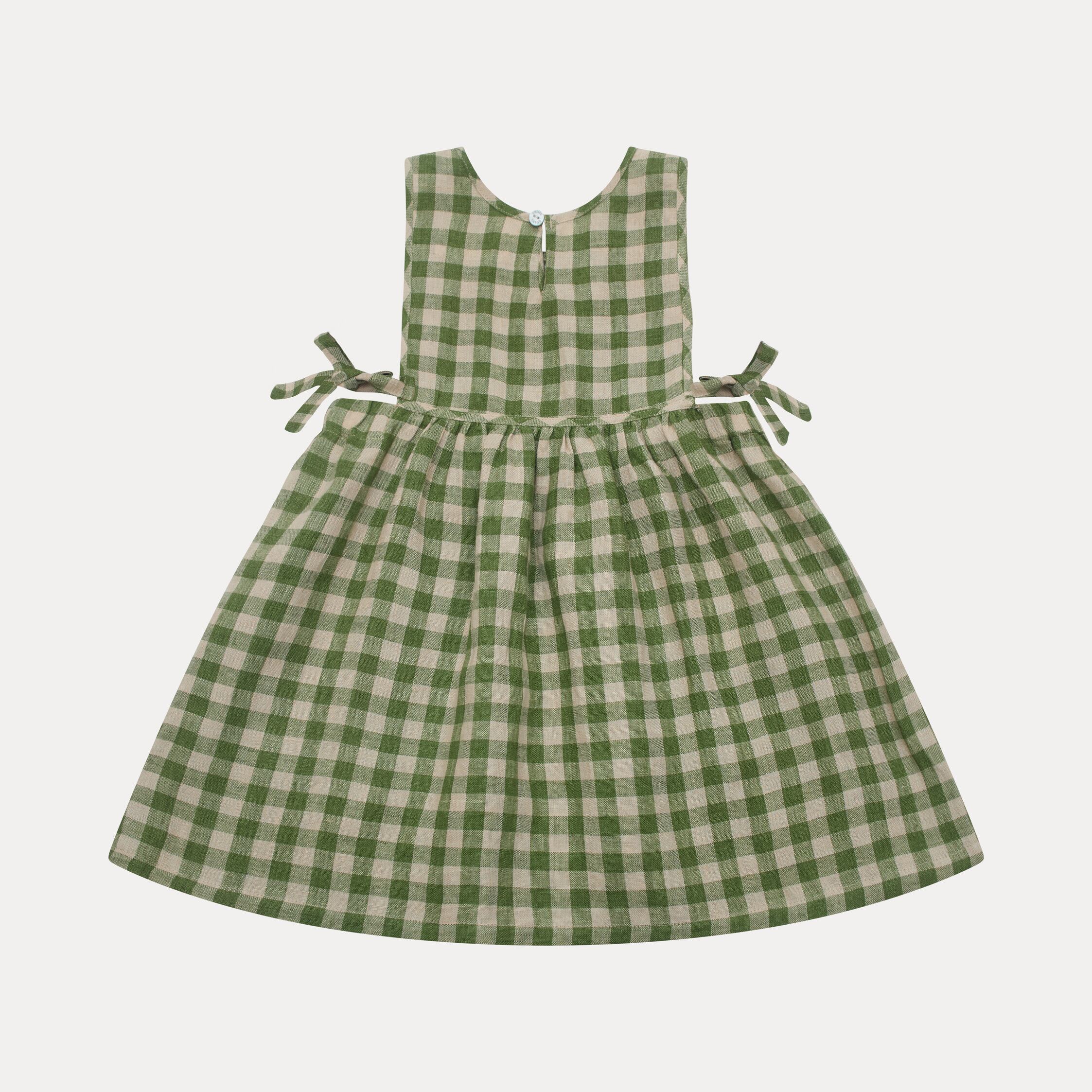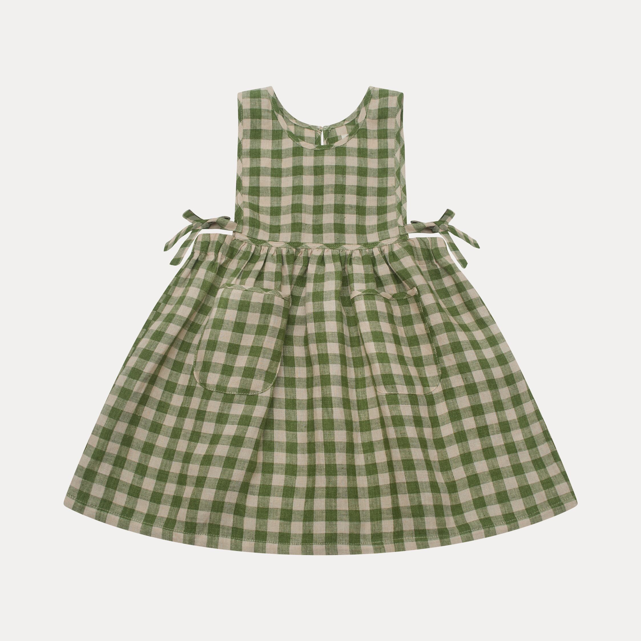 フロントのポケットとウエスト両サイドのタイが特徴のシンプルなエプロンドレス。生地にはエコテックス認証のとても柔らかなミッドグリーンのチェックリネンを使用しています。ゆったりとしたギャザースカートはビブに伸縮性のある縁取りが施され快適さを。トップスによってオールシーズン着用いただけます。
